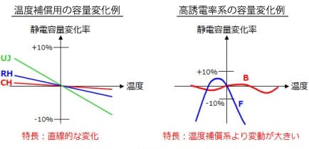 セラミックコンデンサは、図2に示すように温度補償用と高誘電率系に分けられます。温度による静電容量の変化に違いがあり、各特長に応じた使い分けが必要になります。国内ではJIS規格、欧州ではEIA規格で細かく分類されています